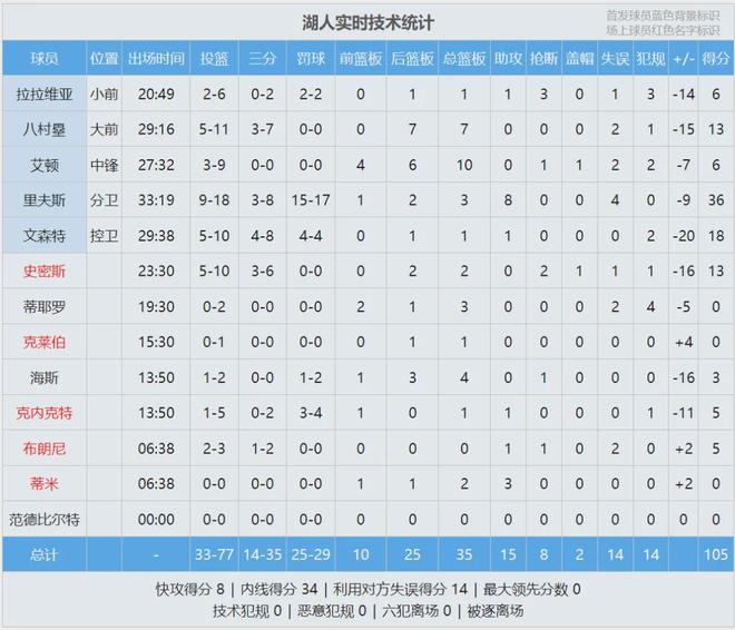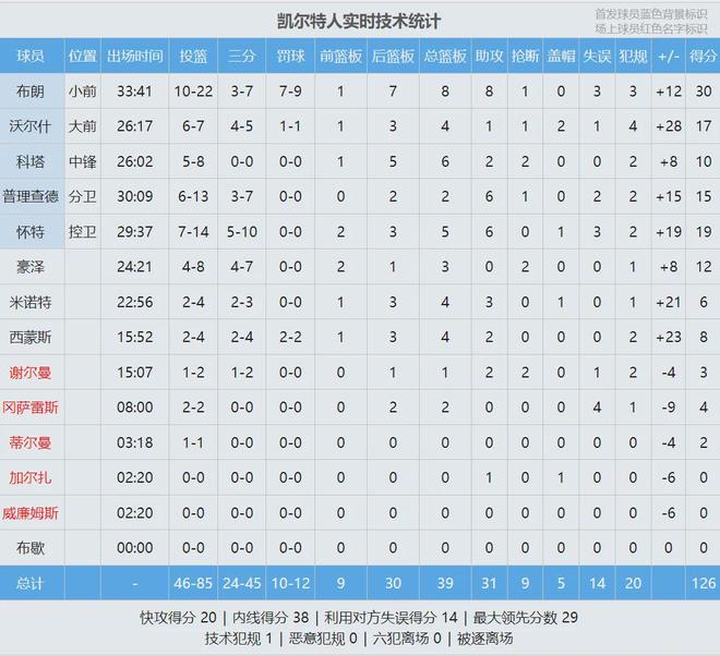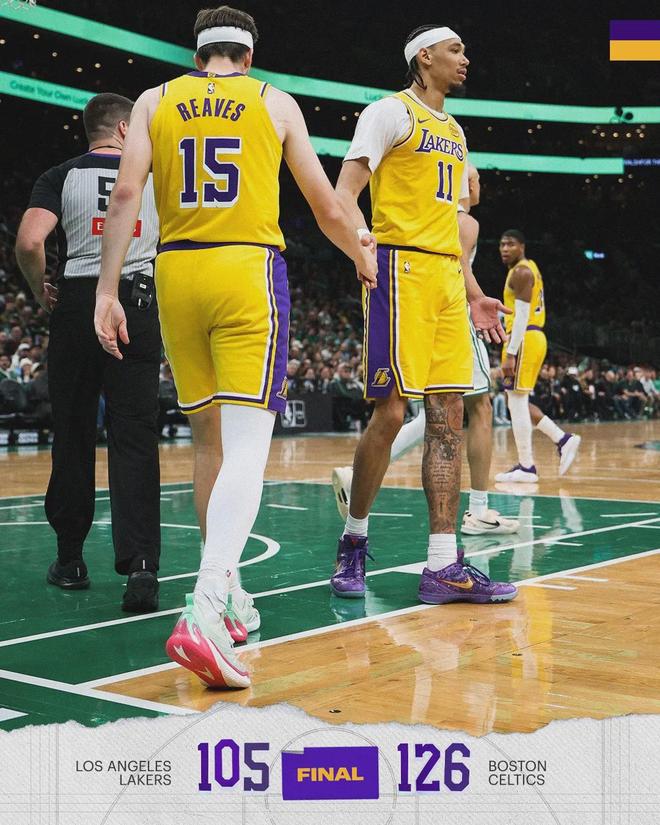 全场结束,凯尔特人126-105大胜湖人。凯尔特人三分球45投24中,把湖人投死了。布朗30分8板8助、怀特19分5板6助、沃尔什17分4板2帽、普理查德15分2板6助。里夫斯投篮18中9,三分8中3,罚球17中15,得到36分3板8助。
