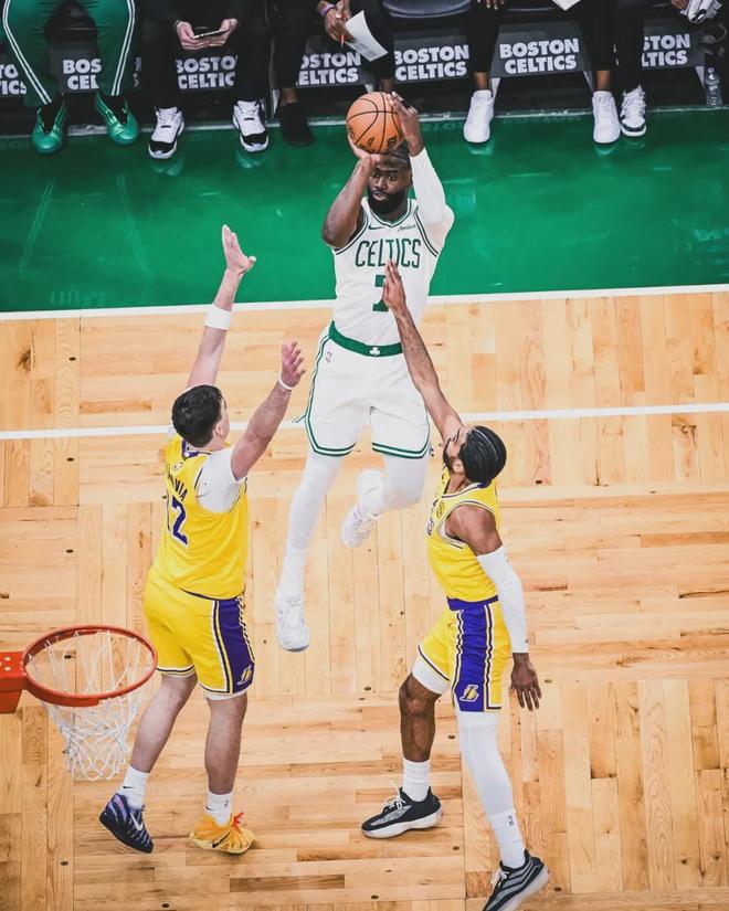 凯尔特人上半场20次助攻,三分球26中13,湖人三分只有17中5。第三节开始,湖人祭出联防,把分差缩小到20分以内。里夫斯跟杰伦-布朗对飙,里夫斯单节9中5得到16分2板2助。杰伦-布朗单节10中6,得到15分2板3助。