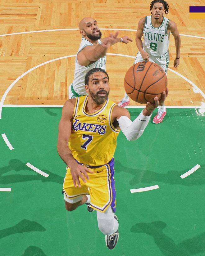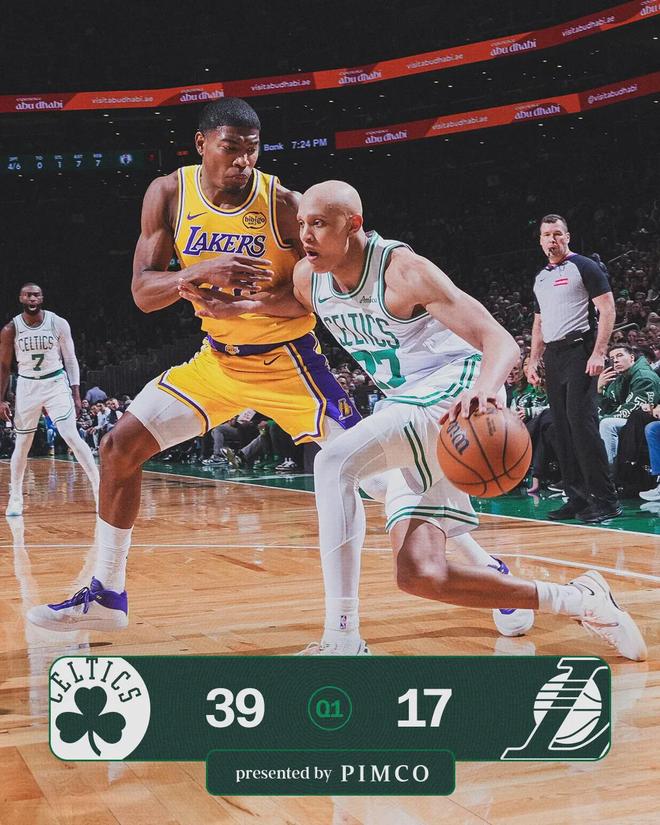 第二节开始,里夫斯手感有所回暖:单节2中2,罚球7中6,拿到10分3助攻。文森特也站出来了,单节9分进账。凯尔特人第二节30-29净胜湖人1分,半场战罢,凯尔特人69-46领先23分。湖人上半场只有6次助攻,均来自里夫斯。